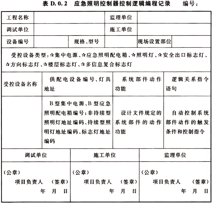 附录D 系统部件现场设置情况、应急照明控制器联动控制编程记录D.0.1 施工单位、调试单位技术人员应按表D.0.1的规定,逐一对每个系统部件填写设置情况记录,应急照明控制器采用字母、数字显示时,可以用字母、数字表示现场部件的设置部位信息,在控制器附近的明显部位应设有现场部件具体设置部位对照表。 ![]() ![]() D.0.2 选择集中控制型系统时,施工单位、调试单位技术人员应按表D.0.2的规定,逐一对每台应急照明控制器填写联动控制编程记录。 ![]() D.0.3 表D.0.1、表D.0.2中带有“☆”标的项目为可选项,当系统部件类型或部件不涉及该项内容时,可不填写。 |